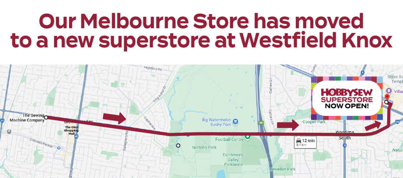 Have your machine serviced and repaired at Hobbysew Melbourne at Westfield Knox. This store was originally Sewing Machine Company at Glen Waverley. Store out the eastern side of Melbourne CBD. Nearby are areas like, Mount Waverley, Ashwood, Wheelers Hill, Glen Iris, Burwood, Oakleigh, Notting Hill, Mulgrave, Huntingdale, Clayton, Murrumbeena, Chadstone, Caulfield South, Malvern East, Ashburton, Oakleigh East, Ashwood, Hughesdale, Carnegie, Mount Oakley. Easy to park right outside the store. Visit now and try our sewing machine servicing and repair.