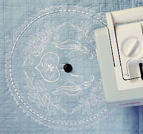 This is a close-up showing the circles of quilting done with the JANOME CIRCULAR ATTACHMENT. This was done AFTER the embroidery, after I had sewn all the blocks together & sandwiched my quilt layers. I slipped the quilt onto the pin of the JANOME CIRCULAR ATTACHMENT making sure the pin went through the exact center of each appliqued circle/hourglass block. Then a simply used straight stitching and let the CIRCULAR ATTACHMENT do the work for me: it feeds my quilt in a circle. NO marking needed, NO need to hold my breath and hope for the best………… just the JANOME tool working for me. WHEW – this is the way I like it!