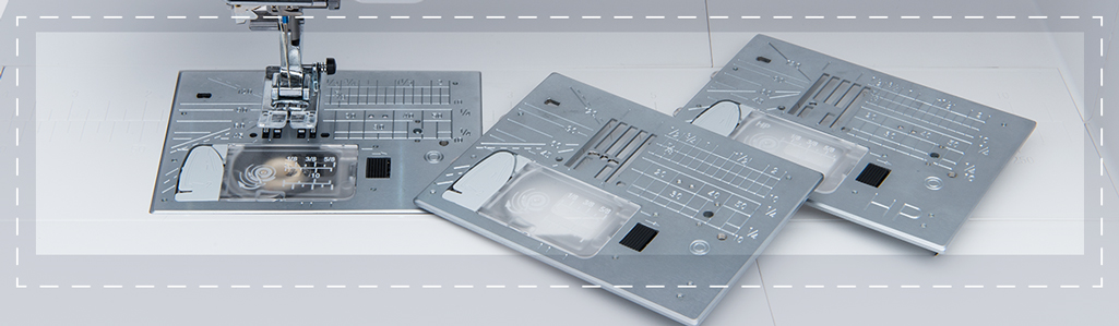 | Easy Change Needle Plate | Has patented needle plate markings for precision sewing with needle drop position, angle marks and sewing guides in front of the sewing foot for perfect placement |