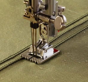 The pintucking foot is used with a 2 mm twin needle to create multiple rows of pintucks. The grooves on the underside of the foot make it easy to stitch several rows parallel and evenly spaced from each other.