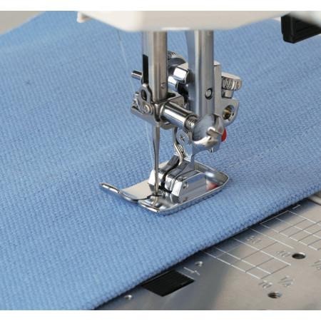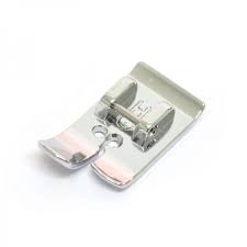 The straight stitch foot is often used on very fine or very heavy fabrics. This particular foot is flat on the underside to provide an even pressure against the feed dogs and it has a rounded needle hole which offers the benefit of more support around the needle to prevent skipped stitches and puckering.